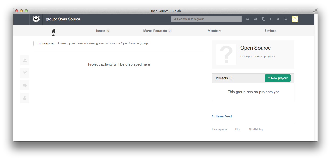 When your group has been created you are presented with the group dashboard feed, which will be empty.